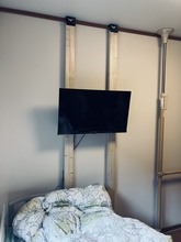 本来であれば壁の下地に固定するのが一般的ですが、今回は設置したい位置に下地が無かったため、柱で突っ張るタイプの専用器具を使用して設置を行いました。